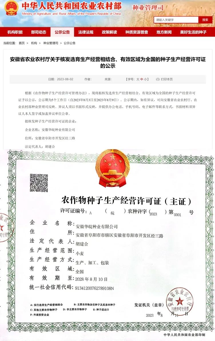 近日,安徽省农业农村厅发布《关于核发选育生产经营相结合、有效区域为全国的种子生产经营许可证的公示》,现公示期结束,安徽华皖正式获得种子生产经营许可证(A证),这表明公司已成为国内为数不多的专营小麦种子的国家级育繁推一体化企业。