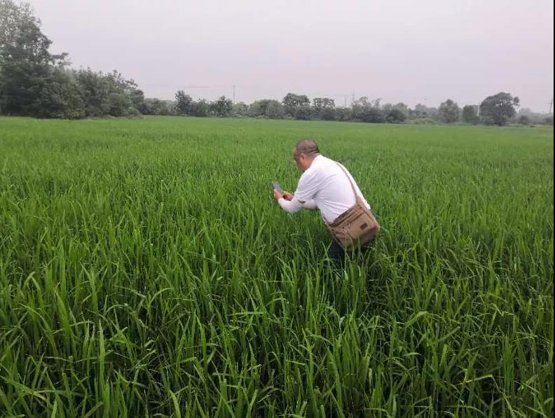 △ 岳阳市建新农场,280亩隆两优1308田间长势、病虫害防治均较好,农技专家在现场查看情况后建议其及时放水晒田。