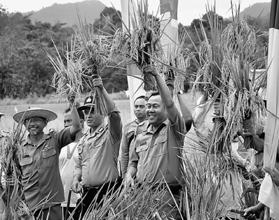 当地政府官员和村民高举刚刚收割的水稻,兴奋地赞不绝口。 印度尼西亚西加里曼丹省山口洋市郊,稻田里一片喜人的绿色。中国…